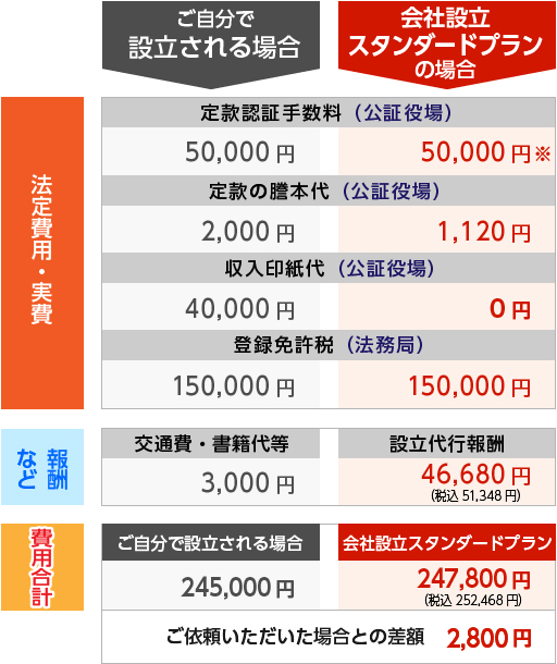 記のプランは丸々代行させていただいて、自分で設立する場合との差額が 2,800円ですから、間違いなくお得です。私どもも自信を持ってご案内いたします。
