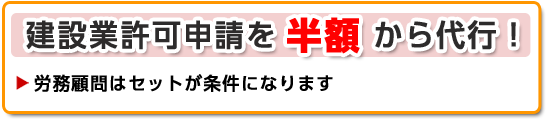 建設業許可申請を申し込みいただく際に、労務顧問も同時に申し込みいただくと、建設業許可申請に関する報酬をなんと、 50%OFFで代行するプランです。